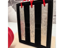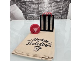 Bid to win this set, complete with Aluminum Christmas Bookmarks, forged by Wendell August. These bookmarks are also paired with a Pittsburgh Penguins 'Hockey Holidays' hand towel and a Penguins Holiday puck, autographed by Tristan Jarry