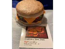 - Freshly baked Peanut butter/Chocolate cake decorated like a cheeseburger! Cake should serve about 24 people.