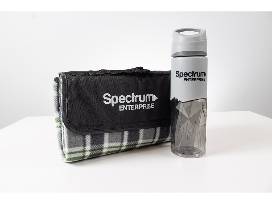 Also includes a Bluetooth Speaker and a Spectrum-branded outdoor blanket, a Spectrum-branded water bottle and two (2) Titleist golf balls - all packaged in a clear beverage bucket. iPad donated by Pomeroy. Specialty items by Spectrum