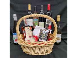 Wines from Baraboo Bluff, Cedar Creek, Cambridge, Elmaro, Door Peninsula and vonStiehl included in the basket,as well as a bottle of J. Henry and Driftless Glen bourbon whiskey.