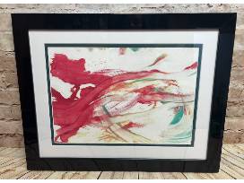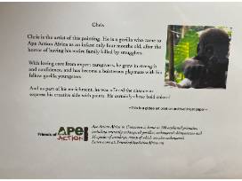 Chris is the artist of this painting. He is a gorilla who came to Ape Action Africa as an infant only four months after the horror of having his entire family killed by smugglers. With loving care from expert caregivers, he grew in strength and confidence, and has become a boisterous playmate with his fellow gorilla youngsters. And as part of this enrichment, he was offered the chance to express his creative side with paints. He certainly chose bold colors!