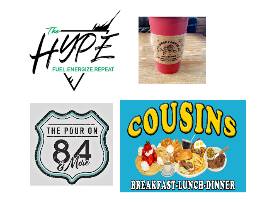 Let us help you start your day off right! This package includes the following; $30 Hype Gift Card, $25 Red Rose Gift Card, $20 Pour on 84 Gift card, and $20 Cousins Gift Certificate!