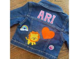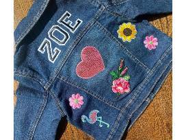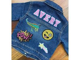 Personalized and customized boys or girls' denim jacket with fun, upbeat patches. Jacket includes child's name or initials and 3-4 patches. Each jacket is unique and happily hand made. Visit @peacelovepatches on Instagram or etsy.com/shop/peacelovepatches for ideas. (Expires March 9, 2024)