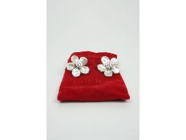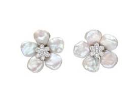 Beautiful silver clip-on earrings shaped like daisy flowers with flower shaped stone in the middle. Fresh water pearl, keshi pearl and Cubic Zirconia earrings measuring 1" x 1".