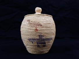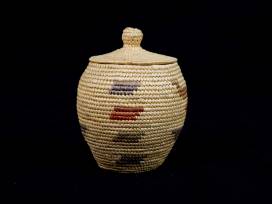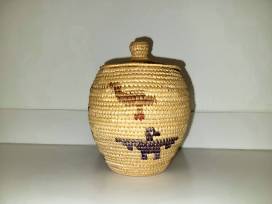 Small, hand weaved, lidded grass basket patterned with a bird design.