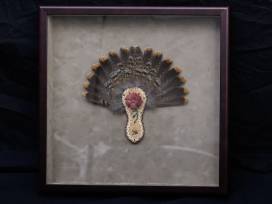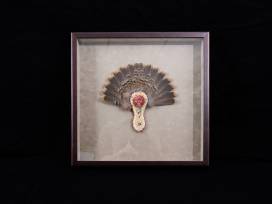 Fan fashioned with spruce grouse feathers, hide and beads, in a shadow box.