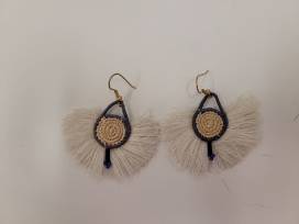 Ear wire earings depicted as Dance Fans made with weaved grass, beads and fur.