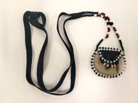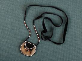 Beautifully sewn seal fur pouch trimmed with beads on a necklace.
