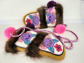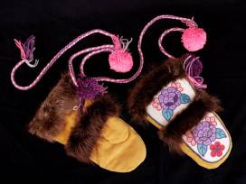 Smoked moose hide and beaver fur mittens decorated with a beaded flower design