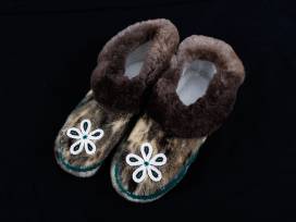 Sealskin slippers decorated with beaded white and green flowers.