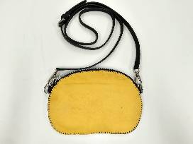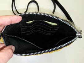 Seal fur and deer hide - hand stitched. Genuine black leather lining & shoulder strap. Six credit card slots and a large side pocket along the opposite side.