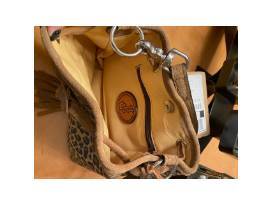 This adorable cheetah print leather purse is made by Double J Saddlery in Yoakum, TX. It has a magnetic snap and drawstring closure. The shoulder strap has a silver buckle and is adjustable. It is real leather, durable, and fun. The exterior is cheetah print leather and the interior is a buttery leather. It has an interior zipper pocket.