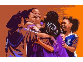 "Teamwork is one of the principal experiences being promoted by America SCORES Cleveland. The poem expresses the joy the kids get from working and playing within a team structure. I photographed ASC teammates celebrating, and then adjusted the photo to appear as a painting, with vivid colors, that exemplifies the joy of accomplishment."