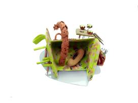 Low-fire earthenware clay, underglaze, handbuilt acrylic plastic, hand-cut