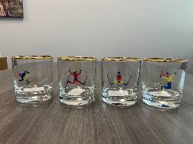 4 Bourbon Glasses, bottle of Jim Beam and Woodford Reserve