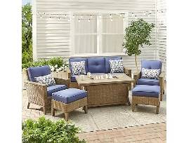 Spring has sprung! If it's time to update your outdoor furniture, raise your bid paddle high and often to win this beautiful six-piece set. In a natural color, this ensemble has two cushioned wicker lounge chairs (each with a pillow}, one cushioned wicker sofa (with two pillows), two cushioned wicker ottomans and a tile-topped woven coffee table fire pit with fire glass and burner cover. Durable all-weather - fade, mildew and stain resistent - wicker ensures long-lasting quality and performance. This set is designed especially for outdoor use to bring you endless hours of entertainment on your porch or patio.
