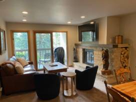 This 2-bedroom condo features a large living room, wood-burning fireplace, two full bathrooms, master bedroom w/ king bed, 2nd bedroom with 2 twin XL bunk beds (4 beds total), and a fully stocked kitchen.