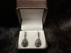 Black Rhodium plated silver and diamond drop earrings, pierced with standard push backs, donated by Holtzmann's Jewelers. There are 70 diamond chips in these beautiful earrings that equal approximately 1 carat.