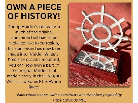 "Educate a Girl, Change the World". Own a piece of The Maiden! Tracy Edwards' Whitbread ocean race winning boat from 1990 was retrofitted in 2017 and is sailing again. Her mission is to enable girls in their education, empower and support them to remain throughout their teenage years to reach their full potential and create better futures for all. Package includes an official T shirt, keyrings made from the Maiden's original lines, precision cut necklace from the Maiden's mainstay, the Maiden Factor wheel made from aluminum, and book signed by Tracy Edwards. https://www.themaidenfactor.org/