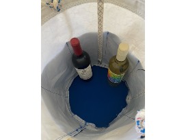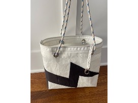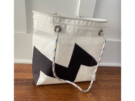 A Nate Hostetter handmade original design made from 100% repurposed sail cloth. There's a chance you've sailed against these sails if you raced at Cherry Creek. Now that they've been given a new life, you can can use them for your very own. This tote has endless possibilities! Dimensions: 12" tall, 6" wide, 12" deep. Includes a lanyard with snap shackle for your keys. There are also adjustable rope handles set in rust resistant nickel grommets and 6 interior pockets!