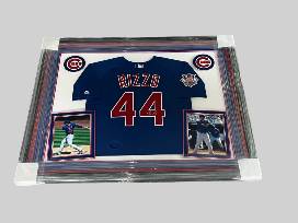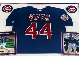 Autographed and framed Anthony Rizzo Chicago Cubs away jersey.