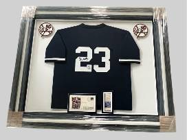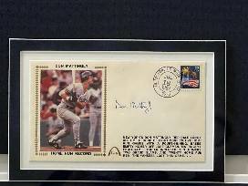 This framed memorabilia package is almost as special as the streak itself. This custom, one-of-a-kind framed collection consists of Mattingly's #23 jersey autographed personally by Mattingly, an authentic original ticket to the third game of the streak in Yankee Stadium and a "First Day Cover" also autographed personally by Mattingly that describes his home run streak. Two Mattingly autographs in one framed piece!