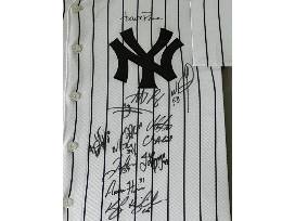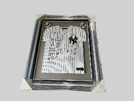 Framed New York Yankees jersey autographed by members of the 2023 New York Yankees.