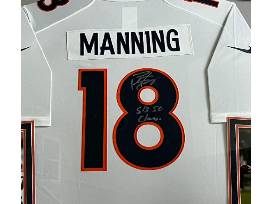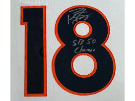 Authentic Peyton Manning autographed and framed Denver Broncos Jersey with the inscription "SB 50 Champs".