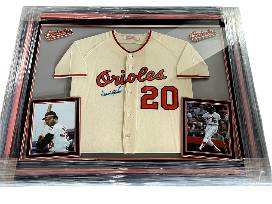Frank Robinson autographed and framed jersey. Comes with a certificate of authenticity.