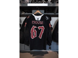 Pre-game worn Black Excellence jersey in size 58. This jersey was worn during warmups of the Coyotes vs. Blackhawks game on February 28th, 2023 and autographed by #67 Lawson Crouse.