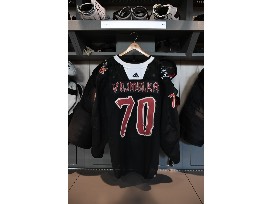 Pre-game worn Black Excellence jersey in size 58G. This jersey was worn during warmups of the Coyotes vs. Blackhawks game on February 28th, 2023 and autographed by #70 Karel Vejmelka.