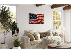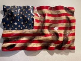 Each flag is hand carved from solid live-oak planks ranging in thickness from 3"-9". The lumber is hundreds of years old and is sourced from old turn -of -the -century mills and farms from around the country. Some flags are carved on both sides to give a realistic 3 dimensional waving affect and to lighten the weight . He finishes with a tinted catalyzed lacquer and catalyzed glaze . The stars are cut from 1/8" oak and are placed on the flag individually. It takes Bear approximately 100-180 hours to complete.