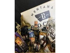 Montana made featuring a Lolo Creek Distillery sign, Lolo Creek Distillery vodka in original, peached, huckleberry and huckleberry bourbon whiskey, 4 rocks glasses, elk and bison jerky and a variety of other alcohol.