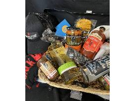 Jack Daniels portable gas stovetop, and picnic basket with all the fixings for Bloody Mary's. 2 bottles of vodka, mixed, seasoning, Worcestershire sauce, olives and plenty of swag.