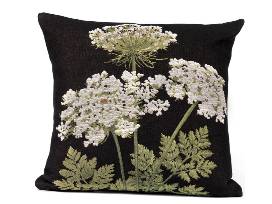 Designed in France, these two White Umbels on Black Tapestry elegant pillows will draw all eyes with the look of fresh flowers on black jacquard cushions. Pillows measure 19" x 19" and are made from a cotton-blend with cotton backs. Zippered to remove for dry cleaning.