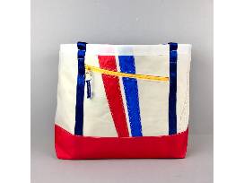 This handmade, large classic drawstring bag is made from the sails from "Brilliant," a historic schooner from Mystic Seaport, CT. Rugged, well-designed, and water resistant, the bag's outside pocket zipper features an aluminum bottle opener. Dimensions: 14.5" H X 18" W 9" D (Bag Expands to 20.5" high)
