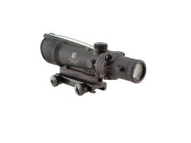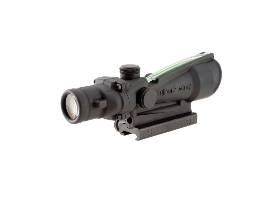 ACOG 3.5x35 scope with Green Chevron BAC Reticle- The ranging reticle is calibrated for 5.56 (.223 cal) flat-top rifles to 800 meters. Includes Flat Top Adapter. The chevron reticle is designed to be zeroed using the tip at 100 meters. The width of the chevron at the base is 5.53 MOA which is at 19" at 300 meters. This allows range estimation for silhouette targets.