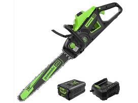 - The 60V 18" Brushless Chainsaw includes a 5.0Ah Battery & Rapid Charger, features an easy push button starting system and a professional-grade brushless motor that delivers ample power for tough jobs.