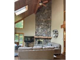 The cabin offers a spacious great room with two story vaulted ceilings connected to a large kitchen & dining area with water views and plenty of natural light. Featuring 3 stone fireplaces, one floor to ceiling and double-sided with the main level master bedroom. First floor also features a handy mud room with laundry. On the lower level enjoy a full-size custom bar, rec room, pool table and card table plus a bedroom and bunkroom. Walkout to the lower level deck to the hot tub and easy access to the lakefront area. Upstairs, 3 large bedrooms plus a full bath and a loft overlooking the great room. Outside entertaining is easy with two grand decks (upper and lower) and even more space on the side deck between the house & garage. The upper deck features Adirondack chairs and a dining table for 8. Lakeside, there is another detached deck with more Adirondacks and a fire pit.