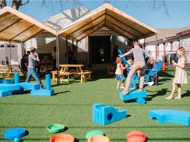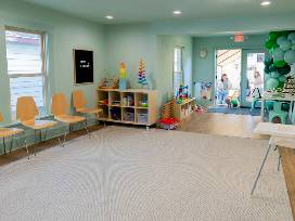 The space includes both indoor and outdoor areas: The indoor space accommodates up to twenty five (25) guests with a kitchenette and toys, while the outdoor area provides seating and tables, with room for up to fifty (50) people.