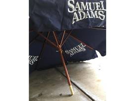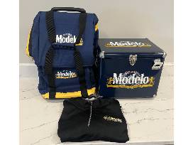Modelo rolling cooler, Modelo cooler, a Mikes Hard lemonade quarter zip pullover XXL, and a Sam Adams Boston Lager 7 foot wood patio umbrella.