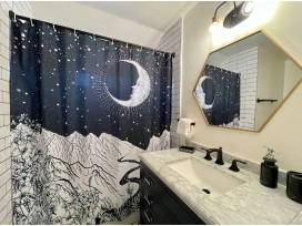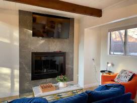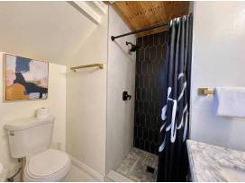 - One bedroom w/ king bed and 3/4 bath (located on entry floor). Includes a dedicated work space with high-speed internet. 3/4 bath features fully tiled walk-in shower with sleek black & gold-toned finishes.