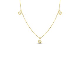 From Roberto Coin's Diamond By The Inch collection, this 18K yellow gold necklace features three stations of round dangling diamonds weighing a total of 0.13 carat. The diamonds are G-H in color and have SI-I2 clarity. The necklace measures 17" in length. Wear this beautiful necklace alone or layered with others! It is stunning on! You can have fun with this piece wearing it every day or a night out on the town!
