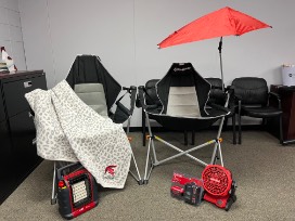 All you need for any outdoor event for any season!!! Air conditioner (with rechargeable batteries), heater, chairs, and umbrella.