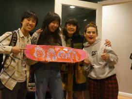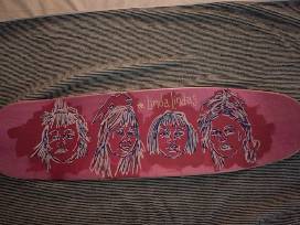 One of a kind, hand painted skateboard, created by Austin, Texas punk legend Tim Kerr, depicting the band THE LINDA LINDAS (Eloise, Lucia, Bela and Mila).