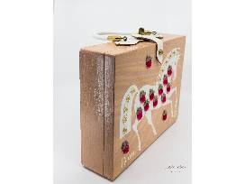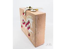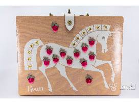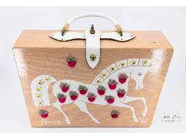 Delightfully whimsical and full of charm, this vintage Strawberry Roan box purse is a true conversation piece. Crafted from smooth wood with canvas accents, it features a prancing white horse adorned with bright red strawberries and cheerful floral details. The playful design captures a sense of nostalgia and individuality, perfect for anyone who loves a touch of retro flair.