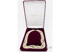 Channel timeless elegance with this vintage Camrose & Kross Jacqueline Kennedy triple strand glass faux pearl necklace. Inspired by the iconic style of Jacqueline Kennedy, this exquisite 30-inch piece radiates sophistication and grace. Each lustrous pearl is perfectly spaced and hand-strung, creating a luxurious drape that flatters any neckline. The silver-tone clasp adds a touch of refinement, completing the look of effortless glamour.