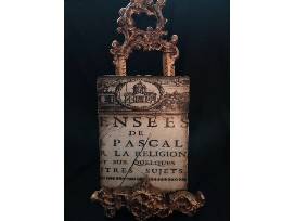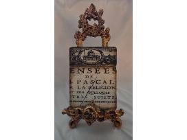 A retired Sid Dickens Memory Block from the Opera T-127 series, featuring a reproduction of Blaise Pascal's Pensées title page. Mounted on an ornate easel, this collectible piece embodies the artist's signature blend of classical inspiration and timeless craftsmanship.