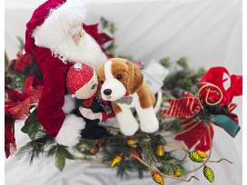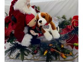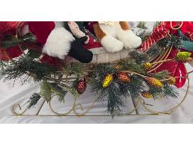 Bring festive charm to your home with this beautifully arranged holiday sleigh brimming with collectible treasures. It features a Joe Spencer Gathered Traditions Santa and elves, a Jim Shore snowman, and an adorable FAO Schwarz plush dog ready to spread cheer. MacKenzie-Childs tea towels add a touch of elegance, while a $25 See's Candies gift card sweetens the season. Nestled in a gold sleigh adorned with greenery, ribbons, and ornaments, this display is a joyful centerpiece that captures the warmth and whimsy of the holidays. Perfect for collectors or anyone who loves the magic of Christmas, it's a timeless piece that will light up any space.