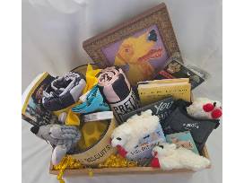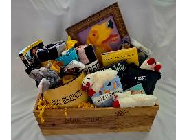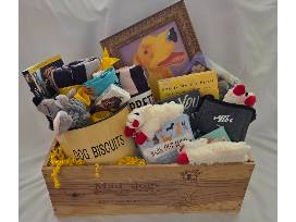 A thoughtful mix of comfort and charm for pet enthusiasts. This wooden crate includes a ceramic dog biscuit container, cozy blankets, books like Dog Is My Co-Pilot, fun plush toys, and a pet rescue alert sign. Perfect for spoiling your furry friend or gifting to a fellow dog lover, it blends warmth, whimsy, and a touch of canine-inspired style.